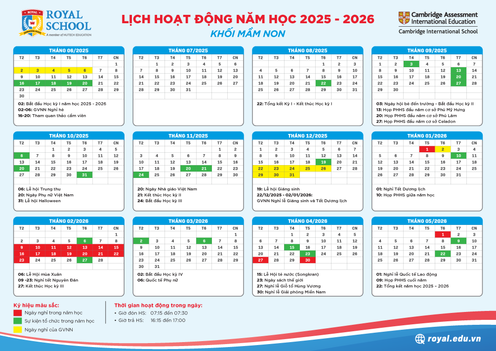 Bên cạnh công tác giáo dục đào tạo, Nhà trường luôn chú trọng chế độ chăm sóc ân cần, chu đáo cùng với dinh dưỡng cân đối và hợp lý nhất để trẻ phát triển toàn diện. Nhằm đảm bảo kênh thông tin về quá trình học tập và hoạt động của trẻ, mỗi tuần ROYAL SCHOOL sẽ thông tin đến Phụ huynh về lịch học tập, sinh hoạt của các em tại trường. Theo đó, Quý Phụ huynh có thể theo dõi thời gian biểu mô tả khái quát một ngày của các bé mầm non tại trường như sau: