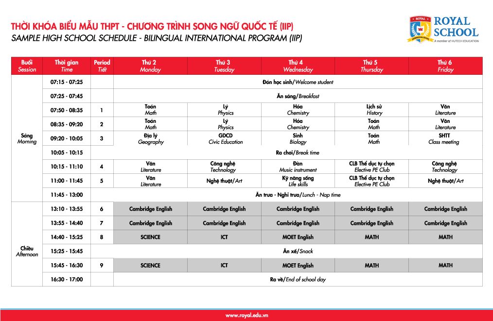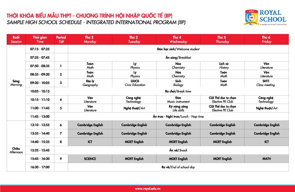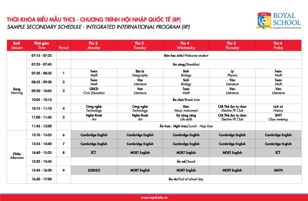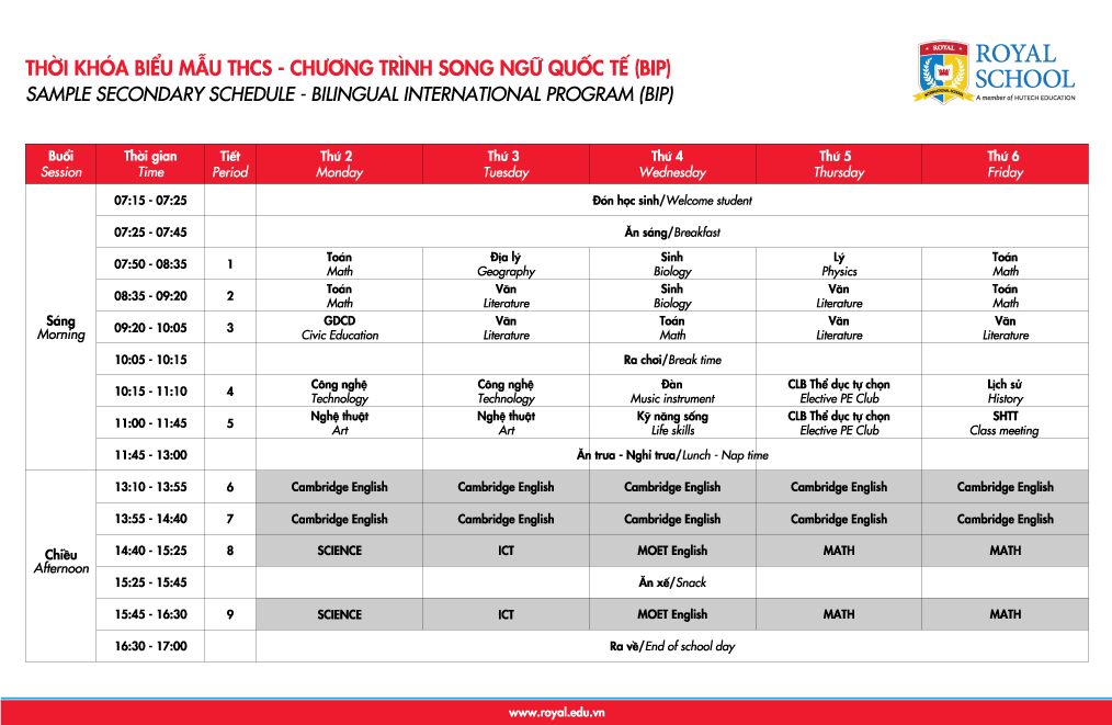 Nhằm đảm bảo kênh thông tin về quá trình học tập và hoạt động của học sinh, mỗi tuần ROYAL SCHOOL sẽ thông tin đến phụ huynh lịch sinh hoạt của các em tại trường. Theo đó, Quý phụ huynh có thể theo dõi thời gian biểu mô tả khái quát một ngày của các em học sinh Trung học tại trường như sau: