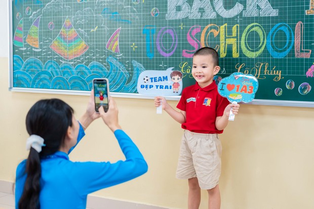 Học sinh lớp 1 Royal School hào hứng chụp ảnh check-in lớp học mới trong ngày tựu trường