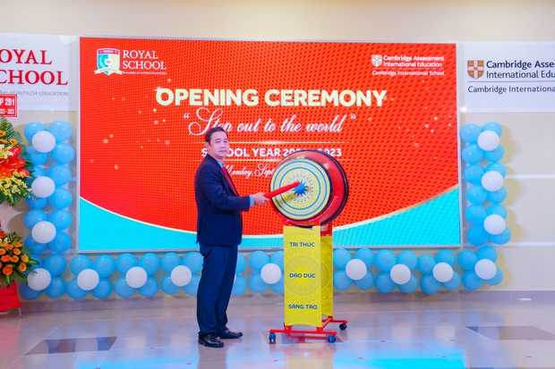Nhắc lại năm học 2021 - 2022 với gần một học kỳ học tập trực tuyến, Hiệu trưởng Royal School đánh giá cao tinh thần giảng dạy, công tác của tập thể CB-GV-NV nhằm đảm bảo nhiệm vụ năm học, truyền đạt tri thức cho học sinh. Đó chính là sứ mệnh đào tạo con người hướng đến tinh thần nhân văn, có trách nhiệm vì bản thân, gia đình và xã hội. Kết thúc những lời chia sẻ chân thành là Nghi thức Đánh trống Khai giảng truyền thống với ba hồi vang lên giục giã, chính thức bắt đầu một hành trình mới để tập thể thầy và trò Royal School cùng nỗ lực hết mình, thi đua trong đổi mới giảng dạy, học tập, nghiên cứu khoa học trên con đường chinh phục tri thức.