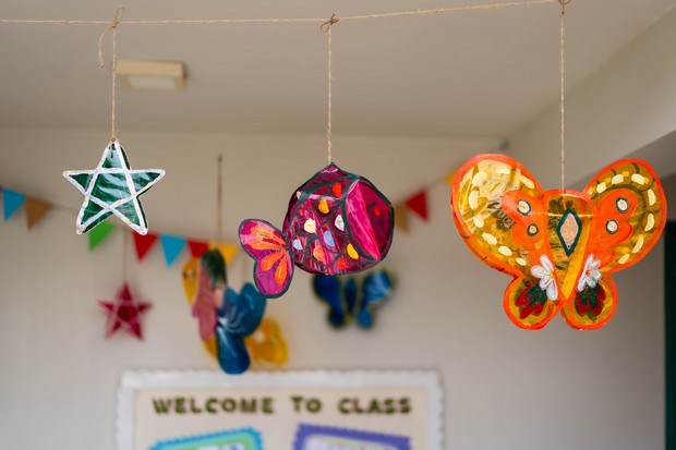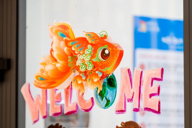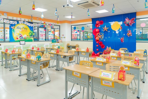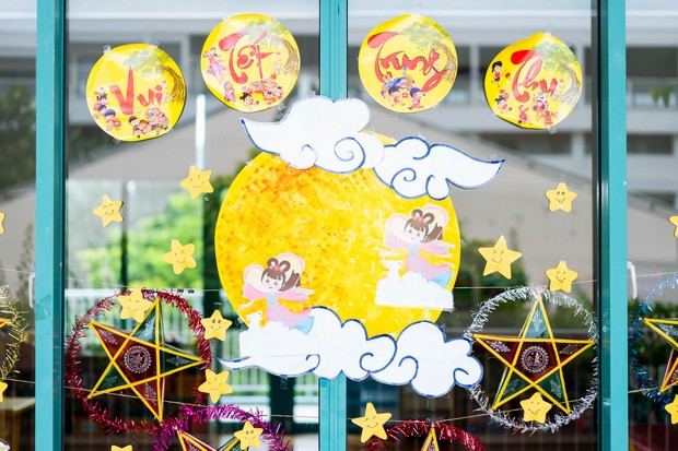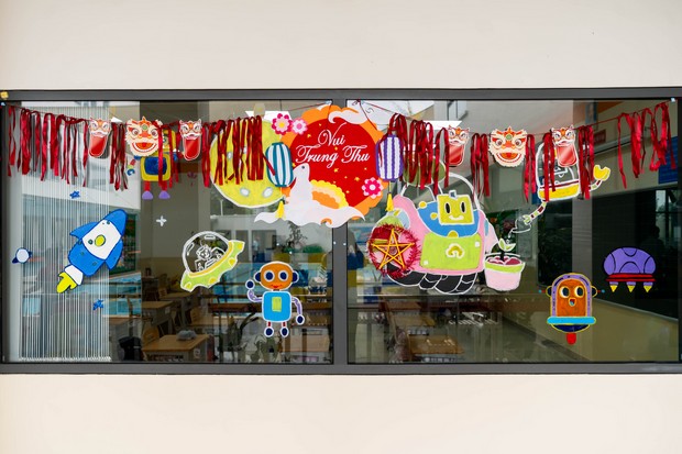 Không gian trong và ngoài lớp học được trang trí rực rỡ với nét vẽ tỉ mỉ, lồng đèn sáng tạo